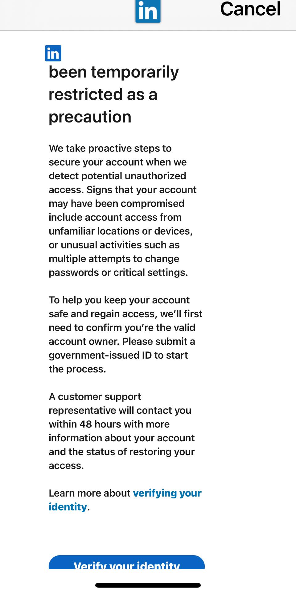 - هک شدن پروفایل: لینکدین برای حفاظت از اطلاعات شما اکانت رو قفل میکنه