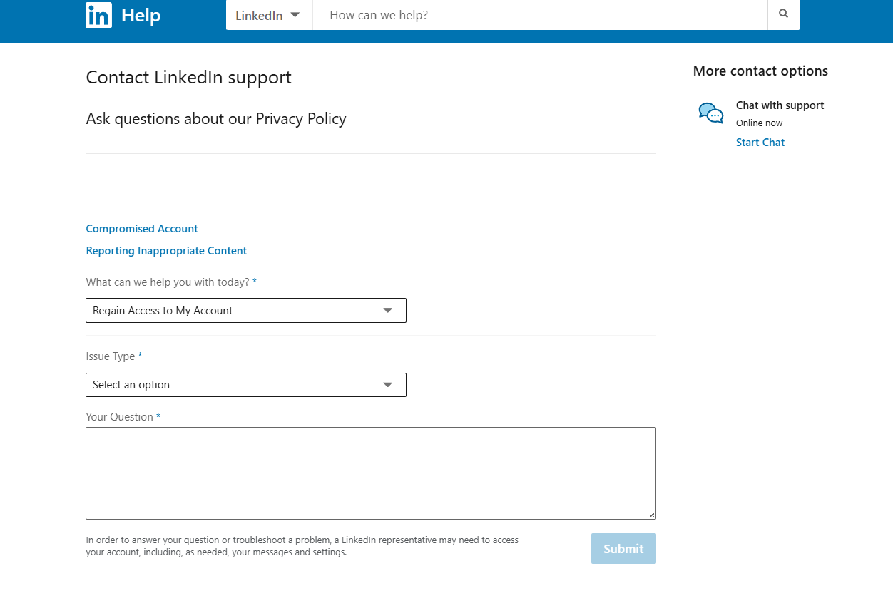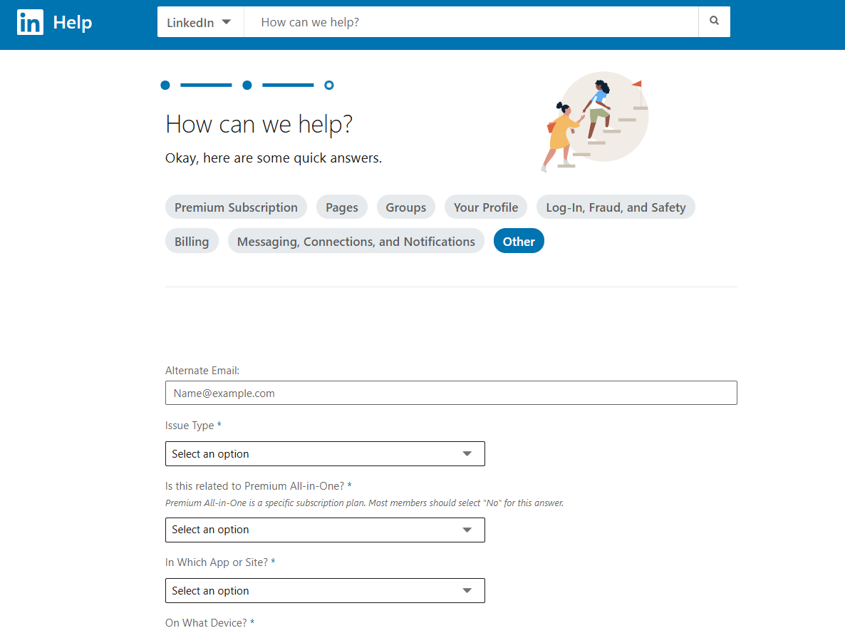 نیازی نیست وارد لینکدین بشی. کل کار از طریق فرم عمومی پشتیبانی انجام میشه.